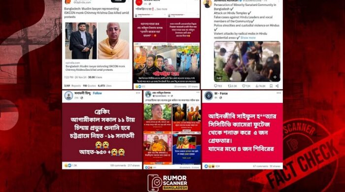 বাংলাদেশ সম্মিলিত সনাতনী জাগরণ জোটের মুখপাত্র চিন্ময় কৃষ্ণ দাসের গ্রেপ্তার এবং তার জামিন নামঞ্জুরের পর সংঘর্ষে আইনজীবী সাইফুল ইসলাম হত্যার ঘটনায় সামাজিক যোগাযোগমাধ্যমে নানা ধরনের অপতথ্য ছড়িয়েছে বলে জানিয়েছে ফ্যাক্টচেকিং প্ল্যাটফর্ম রিউমর স্ক্যানার বাংলাদেশ।