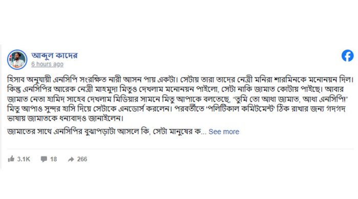 তিনি আরও অভিযোগ করেন, জুলাই সনদ বাস্তবায়নের প্রক্রিয়ায় বিএনপির দেওয়া ‘নোট অব ডিসেন্ট’ উপেক্ষা করা হয়েছে, যা তিনি “এক ধরনের প্রতারণা” বলে অভিহিত করেন।