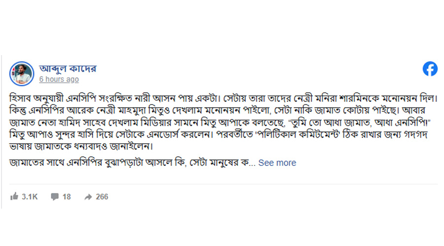 আব্দুল কাদের লিখেছেন, ‘হিসাব অনুযায়ী এনসিপি সংরক্ষিত নারী আসন পায় একটা। সেটায় তারা তাদের নেত্রী মনিরা শারমিনকে মনোনয়ন দিল। কিন্তু এনসিপির আরেক নেত্রী মাহমুদা মিতুও দেখলাম মনোনয়ন পাইলো, সেটা নাকি জামাত কোটায় পাইছে। আবার জামাত নেতা হামিদ সাহেব দেখলাম মিডিয়ার সামনে মিতু আপাকে বলতেছে, ‘তুমি তো আধা জামাত, আধা এনসিপি!’ মিতু আপাও সুন্দর হাসি দিয়ে সেটাকে এনডোর্স করলেন। পরবর্তীতে ‘পলিটিকাল কমিটমেন্ট’ ঠিক রাখার জন্য গদগদ ভাষায় জামাতকে ধন্যবাদও জানাইলেন।’